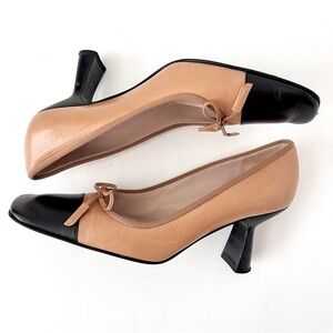 CHANEL | Vintage Beige & Black Leather Cap Toe Square Pumps Bow Logo EU 37.5