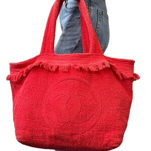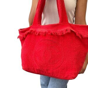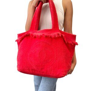 CHANEL Vintage CC Logo Beach Tote Bag Shoulder Red Cotton Terry Cloth [105659]