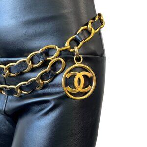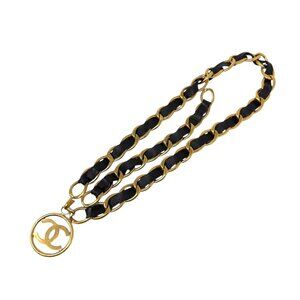 CHANEL Vintage CC Mark Logo Chain Belt Accessory Gold Black Leather [106369]