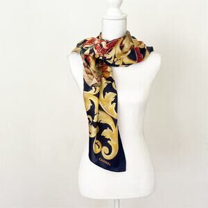 Chanel vintage 1980 oversized scarf with an extraordinary pattern. Inspired by the Italian work of scagiola, that is to say a representation based on stone, this scarf finds all the themes: Acanthus leaves, with various flowers, multicolored birds Large CCs appear discreetly in this painting with very warm colors.