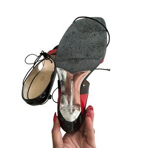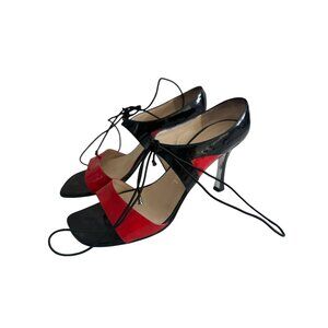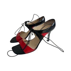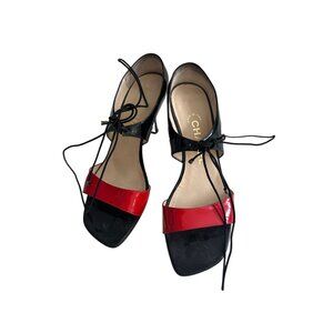 CHANEL Vintage Red Black Patent Leather Laceup Sandals Heels Size 37