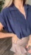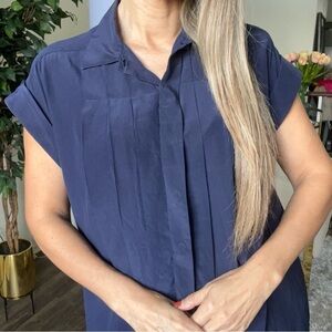 Stunning and unique vintage Chanel Silk pleated draped, button down, short sleeves navy blue blouse. It's in great condition. Size tag has been cut off. We had exactly the same blouse in ivory that sold, thatโs why we know all the label details. Unfortunately Sleeves accent buttons are missing.