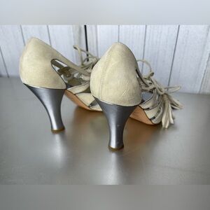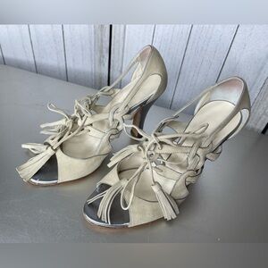 CHANEL WOMEN’S OPEN TOE LEATHER HEELS Sandals- Tie Beige Silver SIZE 37 C - US 7