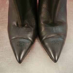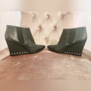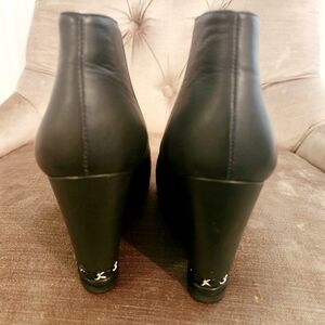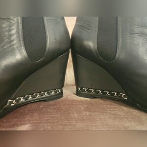 Wedge ankle boots in good condition, recently re-soled, well cared for, features CHANEL signature chain hardware accent with the classic double C logo stitching