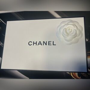 Sophisticated CHANEL box in white. Features iconic camellia detail. Ideal for gifting.