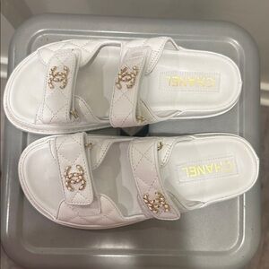 Elegant white quilted slides by CHANEL. Features gold embellishments.