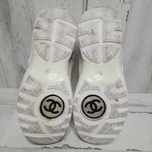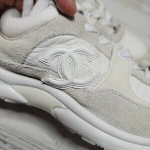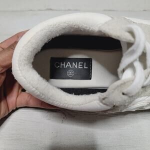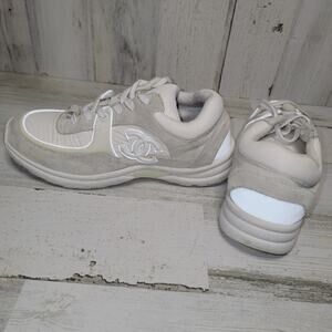 Elegant CHANEL sneakers. White leather with gray suede accents. Perfect for casual wear.