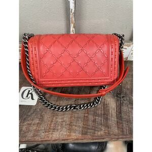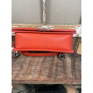 Authentic CHANEL Wild Stitch Boy Bag in Orange-Red Caviar Leather. This rare and discontinued piece features signature wild stitching, a structured silhouette, and antiqued silver-tone Boy clasp. Crafted from luxurious grained leather with tonal interior and adjustable chain-and-leather strap.
