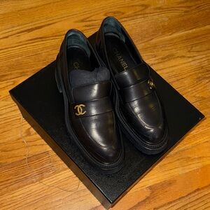 Sophisticated black leather loafers by CHANEL. Features iconic logo detail. Ideal for stylish comfort.