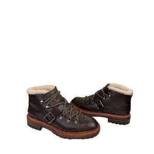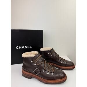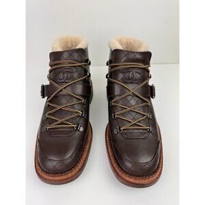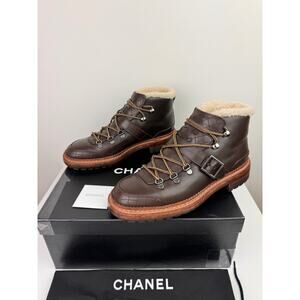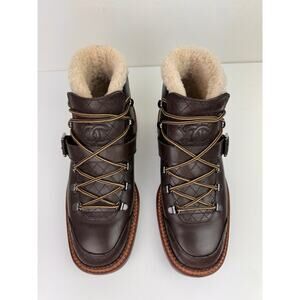 CHANEL Womens Brown Leather Shearling Lined Quilted Combat Lug Short Boot 39