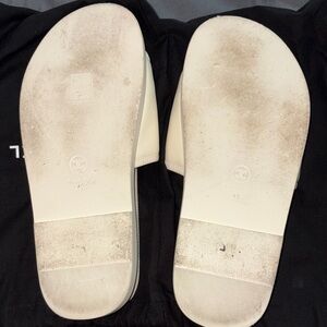 Elegant cream slides with vibrant multicolor lettering. Perfect for casual elegance.