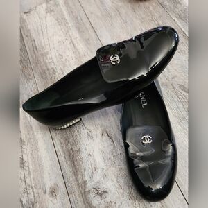 CHANEL Women's Limited Edition Black Patent Leather Semi Pointed Toes CC logo Pearls at Heel Moccasin Loafers. *** A little bent at toes but smooth out once you put them on***( Authentic) Great Condition!!!! No Box