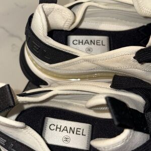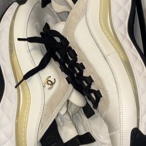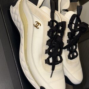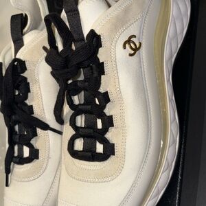 Elegant CHANEL sneakers with a white and beige design. Features black laces and iconic logo detail. Perfect for casual wear.