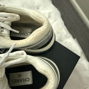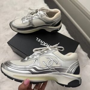 CHANEL Women's White and Silver Sneakers. Stylish and comfortable design. Only worn a few times at home. Shoes come with box and dust bag. Size 39