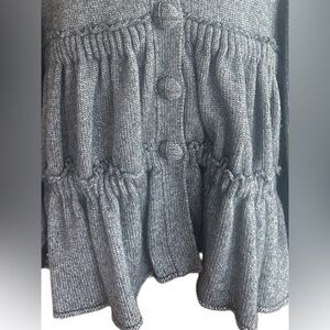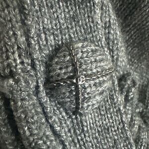 Luxurious CHANEL cardigan in a chic gray wool blend. Features elegant button details with the double C logo on each of them in metal with a small metal chain cross detail. The sleeves are pleat puffed at the shoulder for a beautiful boho look and feel. Perfect for a stylish look to pair with jeans and boots for the fall.