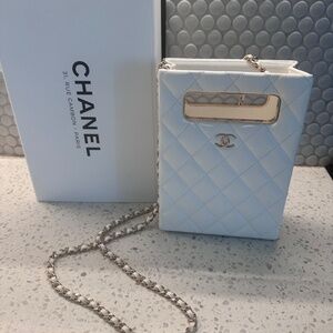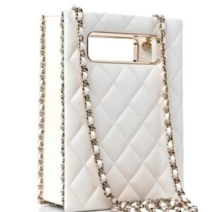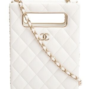 This CHANEL clutch showcases a luxurious white quilted leather design with a diamond-shaped pattern, offering a sophisticated and textured appearance. The bag features a stylish metallic handle, enhancing its elegant look, making it a perfect accessory for special occasions. Dorit on Real Housewives Beverly Hills carried this same style. Paris purchased with original packaging special white box