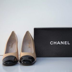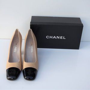 CHANEL beige leather heels with black patent toe, embroidered CCs, US 10