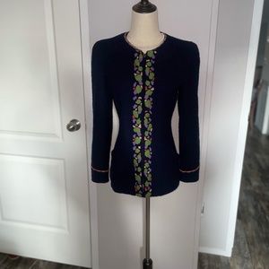 VINTAGE CHANEL navy boucle jacket in beautiful condition. Silk logo lining with weighted hem.....matching trim on sleeves and jacket.