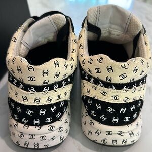Amazing CHANEL suede sneakers with all over logos. Gently worn. Note: There is some wearing off on the logos on the front toe of one of the shoes. And some discoloring/darkening of the suede in a few spots. Please see all photos! Purchased from Tradesy. Includes box and extra laces.