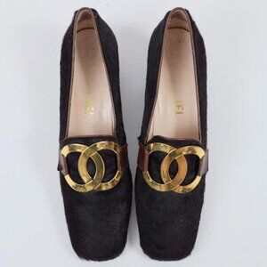 CHANEL shoes 39 US 9 pony hair XL huge CC logo buckle low 2" heel Vintage 1995