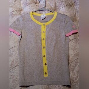 Chanel Top with Pink and Yellow design. Interlocking CC on each of the buttons at the front. Tags are faded as expected with age. 08P. One small, tiny hole on the back as shown in picture. Has normal preloved wear. Pink CC on one sleeve. Super pretty! Measurements are in the picture. Material has some stretch to it. (85% cotton and 15% cashmere) Please ask all questions prior to purchasing. No returns, all sales are final. Has been dry-cleaned and ready to Ship.