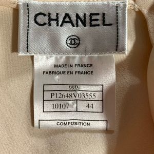 VINTAGE authentic CHANEL beige silk sleeveless shell blouse with button closure at the back. VERY GOOD VINTAGE CONDITION, shows light discoloration at neckline interior. From the Spring/Summer 1999 Collection SIZE 44 MEASURES 42" Bust 44" Waist 23" Length MADE IN FRANCE RETAIL $1800