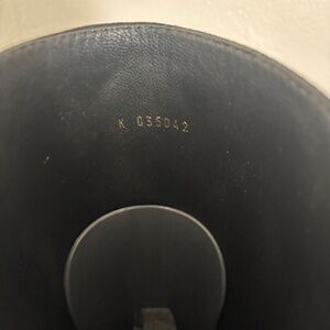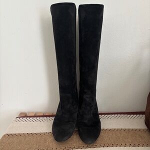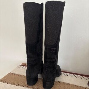 CHANEL charcoal black suede boot with tweed calf/back and very modest interlocking "CC" on the back/side.