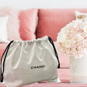 All white with black CHANEL logo and black drawstrings, this bag can be used as a gift bag, storage, dust bag, make up bag, drawstring hand purse, travel accessory, etc. Approximate: laying flat W 12”, H 7.5”, bottom 8.5” x 5”