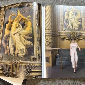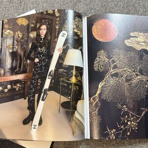 Chanel magazine cover with elegant black fashion. Model in striking pose on grand staircase.