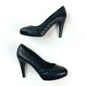 CHANEL Quilted Platform Black Pumps Size 38.5 US 8 CC Logo Heel Cap Toe