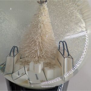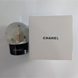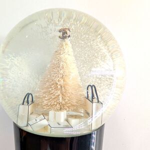 Chic CHANEL snow globe with a cream tree and black accents. Ideal for stylish decor.