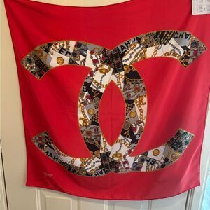 Luxurious red scarf with bold gold chain design. Elevate your style effortlessly.