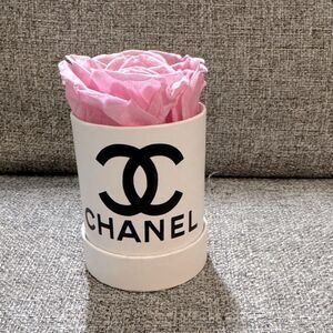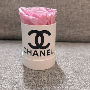 Chic CHANEL inspired eternal rose in box in white. Features a pink eternal. Ideal for stylish decor.