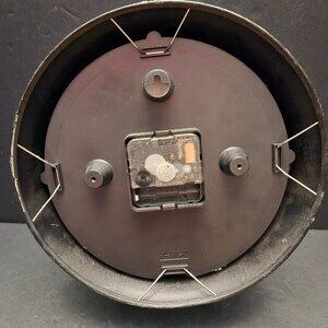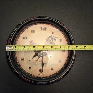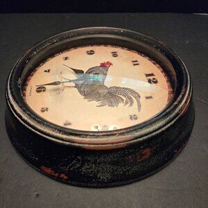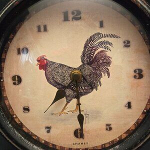 CHANEY METAL ROOSTER WALL CLOCK, BY ARMSTRONG. WORKS GREAT. TAKES A DOUBLE A BATTERY. CLOCK IS METAL, NOT PLASTIC. NO CHIPS OR CRACKS.