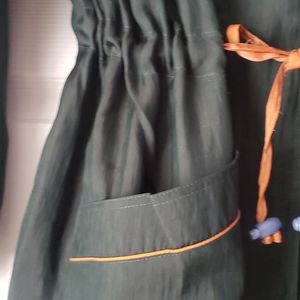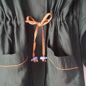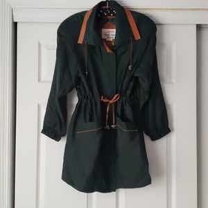 CHANG CHENG design, vintage-style lightweight trench-coat. hits mid thigh. 100% tussah silk. features: cinchable waist (w/ toggle cords), large open pockets at the side, breathable panel at the back, fold-over collar, hidden button-down panel. pine green and tan color. no size tag but fits like an 8 and will list it as. an older style but in clean and very good condition. not weather-proof but a good layerable jacket and statement piece for the Spring, Summer, and Fall months.