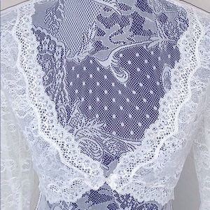 Open front, long sleeves, cropped fit, sheer lace construction, scalloped lace trim, approximately 15 inch length, and imported. Runs true to size. Gorgeous, romantic French allure was Feature in their lingerie line. However, Would look beautiful over a summer dress.