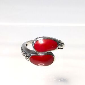 Pretty filagree sterling silver and coral bypass ring.