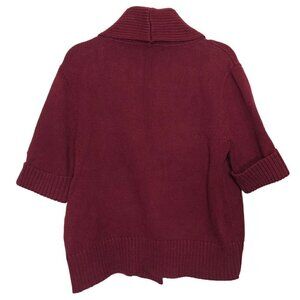 CHAPS - 100% Cotton Burgundy Short Sleeve Button Front Cardigan Sweater Size Small. Some wear on the leather wrapped button as shown otherwise there are no visible flaws. Excellent pre-owned condition.