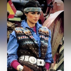 CHAPS AZTEC ETHNIC TRIBAL KNIT VEST. Lovely tones of brown, cream and tan with subtle pink accents are knit together. Shawl collar.Faux horn closure a d inner button clasp.Size tag is S, but you must see measurements for your best fit.No smoke,odors or pets. No stains or tears. Ralph Lauren photos for reference only.