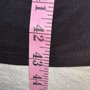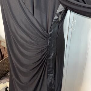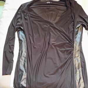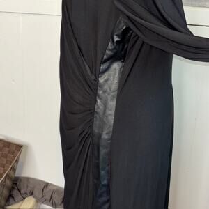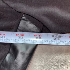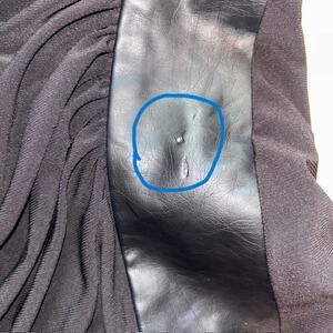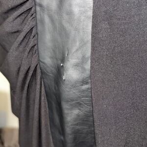 Leather accents make it a work to evening dress. Faux wrap surplice bodice and knee length. See pictures for measurements.