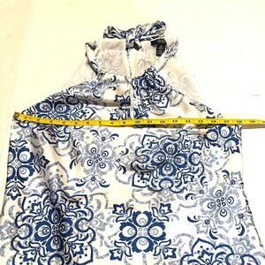 CHAPS Blue and White Tie Back Halter Silky Tank Top Women's M Medium. Keyhole Detailing. Exaggerated Tie Behind Neck. So Pretty! Measurements in Pics. GUC, small marks within print near hem; see pic.