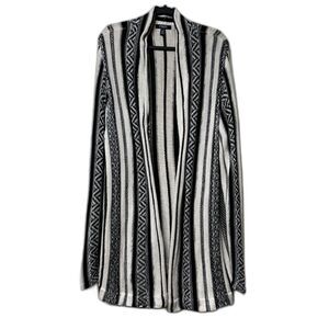 Soft cotton, long line open front sweater cardigan. Southwest design. Classic navy and ivory neutral colors. Shawl collar. Throw this over a white blouse and your favorite pair of jeans or wear it as your favorite lounge sweater.