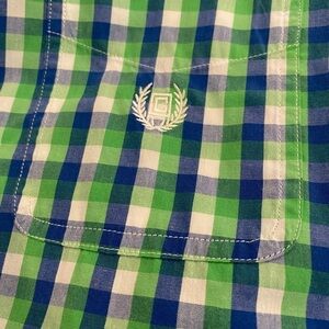 CHAPS Size Large Easy Care Checked Button Down Logo Shirt Vivid Blue /Green. Preowned. Nice condition. This nice shirt has a logo on the front pocket.