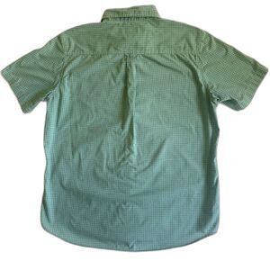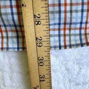 One shirt - green/white plaid/checker; one shirt - orange/dark blue/light blue/white plaid/checker