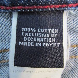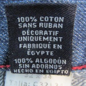 CHAPS MEN'S SIZE 32 X 33 JEANS DARK BLUE SLUB DENIM STRAIGHT FIT VINTAGE. Fabric: 100% Cotton. Traditional 5 pocket jeans. Tag says: "32 x 34" but actual measurements are below. Factory distressed whiskers & fading. Intact & working metal zipper in front fly. Antique brass color riveted button on front waistband has a C in a square with a laurel wreath around the circumference. Antique brass color rivets on front pockets say: "CHAPS 1978" around the circumference. Tan faux leather label on back waistband. Back yoke. 5 belt loops. Traditional gold top stitching. The pictures show the exact item you are purchasing. ** Color may be slightly off due to monitor color setting/flash of camera **.