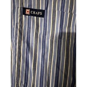This CHAPS button-down shirt is perfect for the stylish and casual man. The shirt features a blue striped pattern, long sleeves, and a button closure. It is made of a comfortable blend of polyester and cotton, with easy-care and stretch features. The shirt is designed with a regular fit, button-down collar style, and accents for added detail. It is a size 2XL and ideal for any occasion.