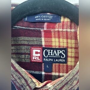 Add a touch of classic style to your wardrobe with this CHAPS Ralph Lauren Brushed Flannel Shirt. The plaid pattern, collared neckline, and button-down closure make it a great choice for work, travel, or casual wear. The shirt features long sleeves, a relaxed fit, and unlined fabric for year-round comfort. It also has convenient pockets for storage and comes in a multicolor design with a Chaps Ralph Lauren logo accent. Perfect for those who appreciate the hipster, western, or American style, this shirt is a great addition to any outfit. Made of cotton, with a size of large, this button-up shirt is perfect for those who love retro, 80s or 90s classic, or outdoor-themed clothing.