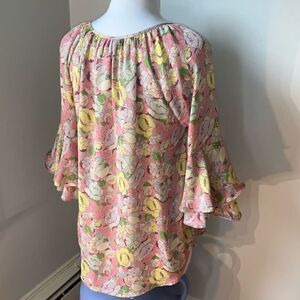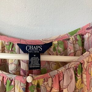 NWT Chaps Ralph Lauren Poet Blouse, Medium. Tiered ruffle bell sleeves. Scoop neckline with keyhole button. Gauzy, flowy, lightweight. Pink crepe like, gauzy, loose fitting blouse. Floral. Flat lay 26” L, 19” P-P approx. #boho #cottagecore #poetblouse