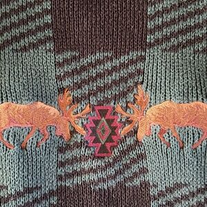 CHAPS Ralph Lauren Plaid Mens Pullover Sweater Moose Green Black. Color is accurate in first picture. Pullover crewneck sweater with a green and black plaid pattern and an appliquéd 2-moose design. Banded cuffs and hem. 100% cotton. Thick, nice quality. Excellent, clean condition with no fading, holes, or snags. Mens size Medium.