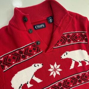 Celebrate the season with this vibrant red crewneck sweater from CHAPS, showcasing a delightful Nordic pattern. The intricate design features white polar bear silhouettes and snowflakes, offering a classic winter holiday aesthetic. Made from a cozy knit material, this sweater ensures warmth and style during the chilly months.